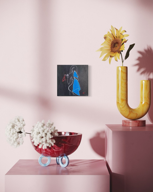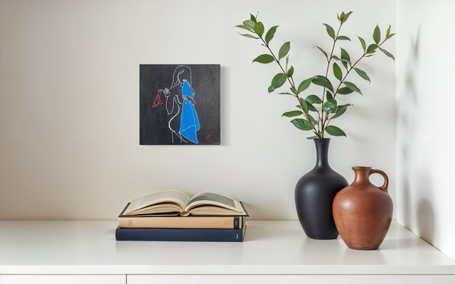 Une femme sensuelle, drapée d’une serviette et tenant son string à la main, se révèle dans une posture à la fois intime et provocante. Cette œuvre, réalisée en one line, explore le désir et l’audace, capturant l’instant fragile où l’abandon devient liberté.