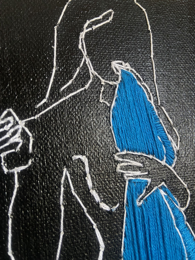 Technique : broderie en fil de coton blanc avec détails pailletés sur toile peinte à l'acrylique, montée sur châssis.