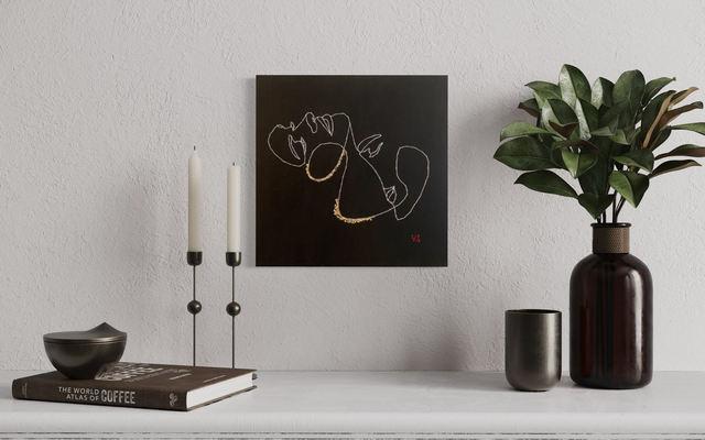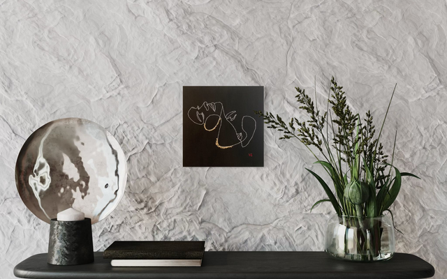 Un couple en one line s’abandonne dans un baiser au creux du cou, geste sensuel et tendre sublimé par des rehauts de feuille d’or. Cette œuvre capture l’intimité et la passion, entre force du désir et délicatesse des émotions.