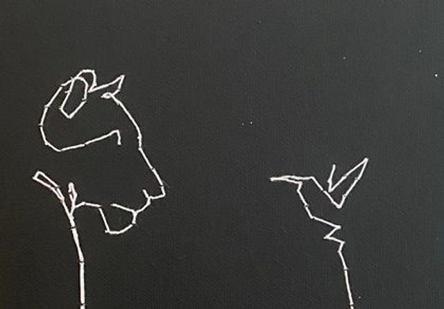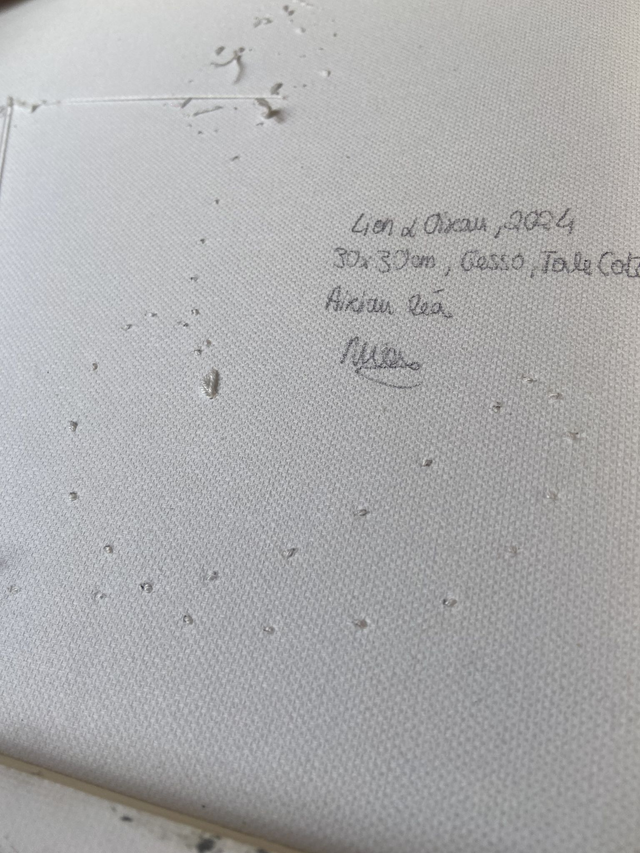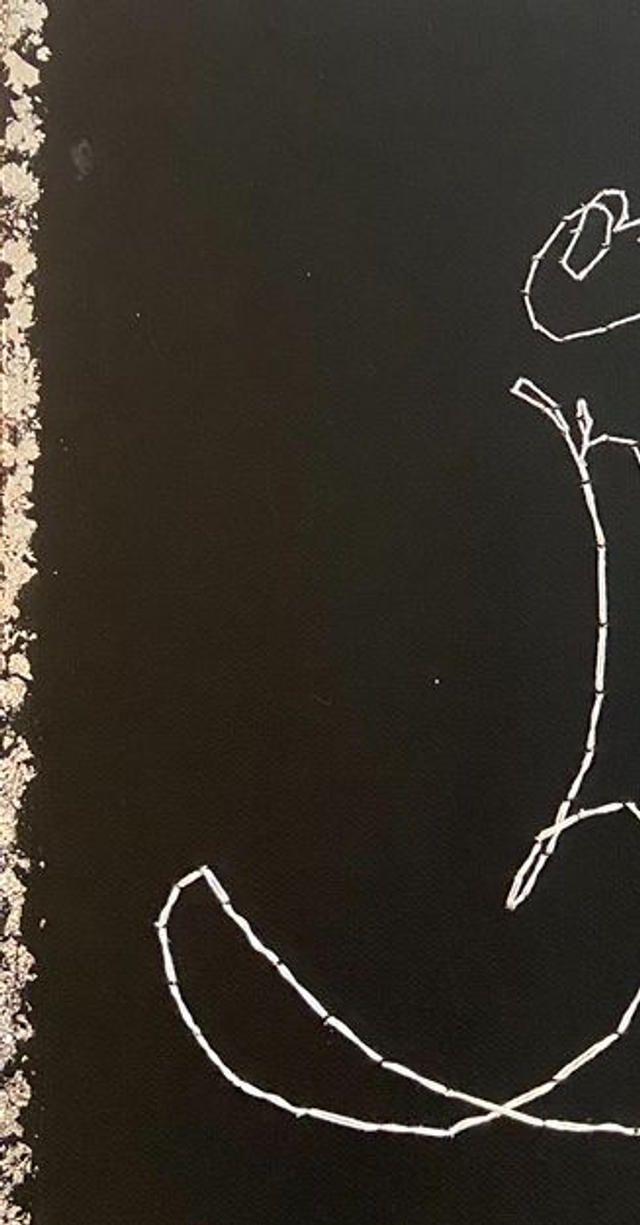 Technique : broderie en fil de coton sur toile peinte au gesso noir, montée sur châssis
